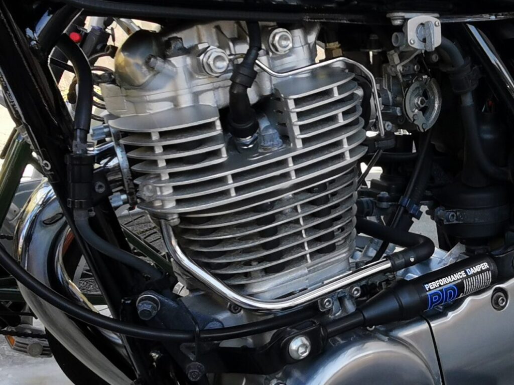 まず現在新車販売されているバイクのエンジン形式は単気筒~4気筒(シリンダーの本数の違い)が主流です。その中でも特に250㏄以下のバイクに採用されることの多い単気筒エンジンをSR400は搭載しています。400㏄クラスで単気筒というバイクは珍しくその特徴からビッグシングルと呼ばれています。